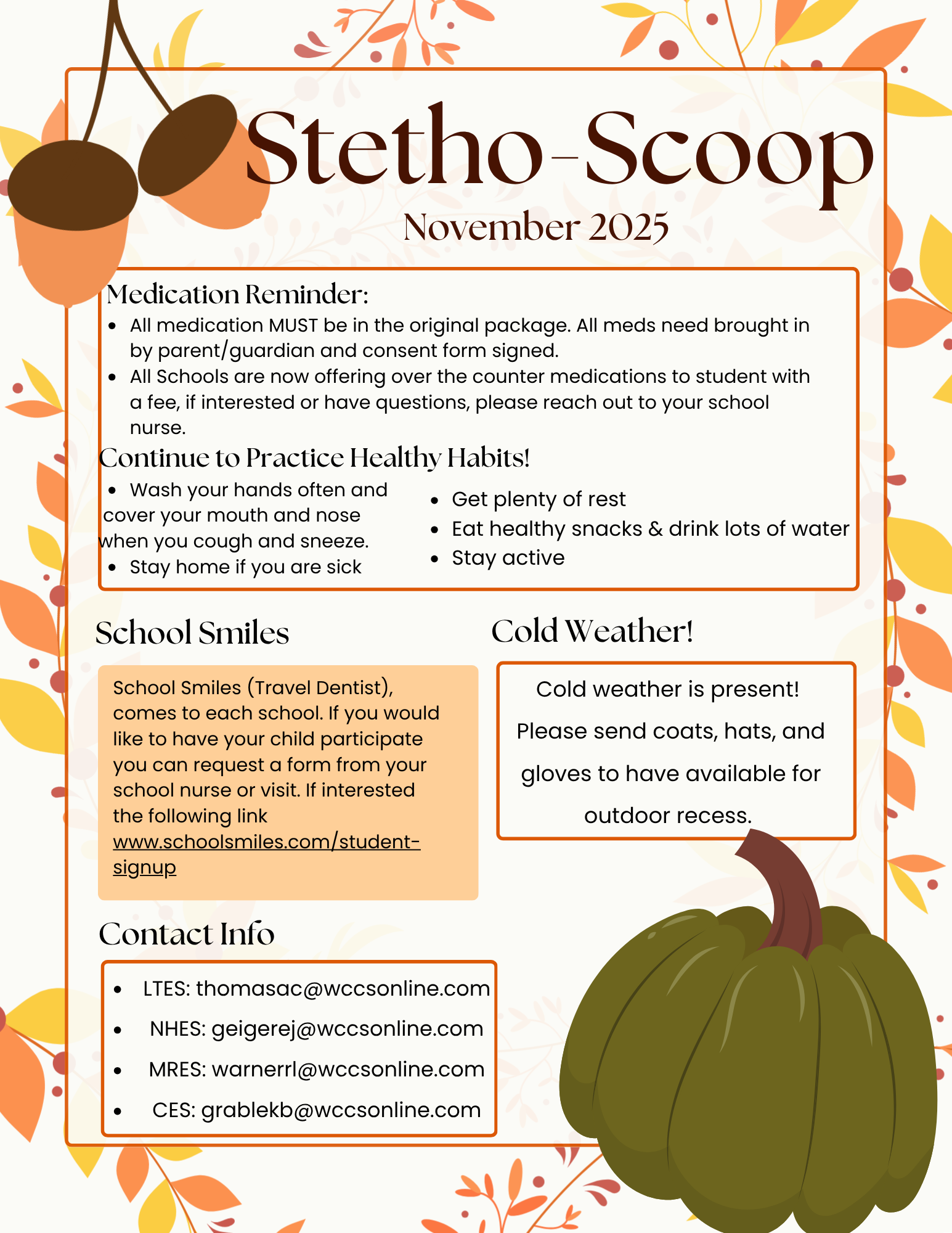 As the weather turns colder, please remember that all students will have outdoor recess unless it is raining or the temperature, including wind chill, is zero or below. Please dress your child accordingly.